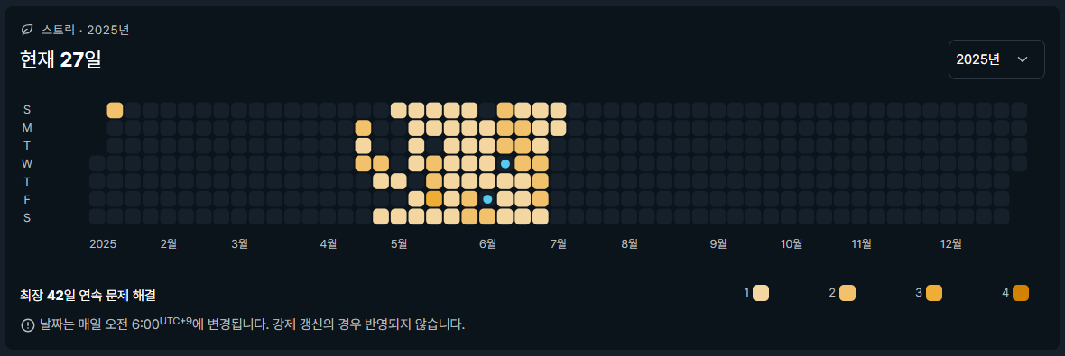 처음 시작할 때는 주에 2~3문제 풀면 다행이겠다 생각했는데, 어느새 한달을 넘어 두달 이상을 꾸준히 풀어가고 있습니다. 당직 근무 때 스트릭 프리즈를 미리미리 구비했더라면 스트릭이 꾸준히 이어졌을 텐데, 아쉽습니다.