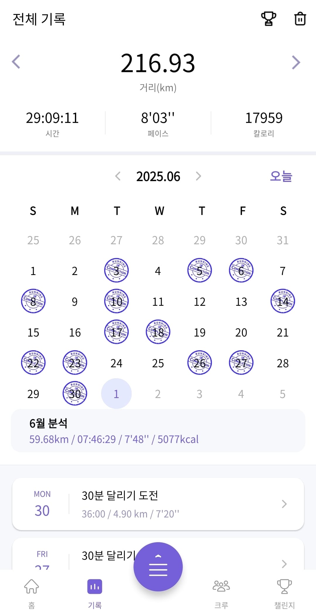 6월 누적으로 59.68km, 앱 전체 누적(작년 말부터 기록되어있습니다)은 216.93km나 뛰었습니다! 6월 중에 누적 200km 돌파했습니다 😄