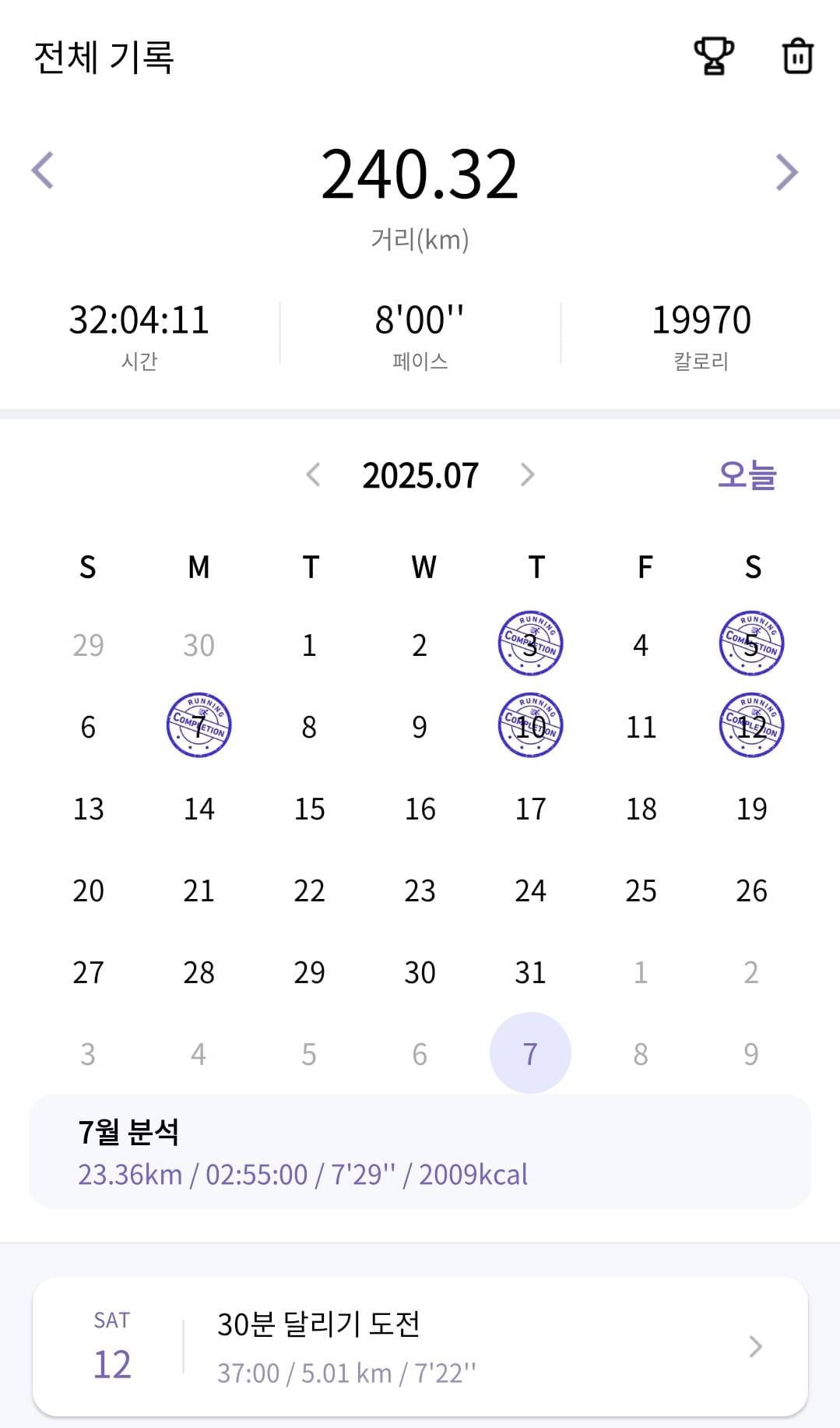 7월 누적으로 23.36km, 앱 전체 누적(작년 말부터 기록되어있습니다)은 240.32km뛰었습니다! 🏃