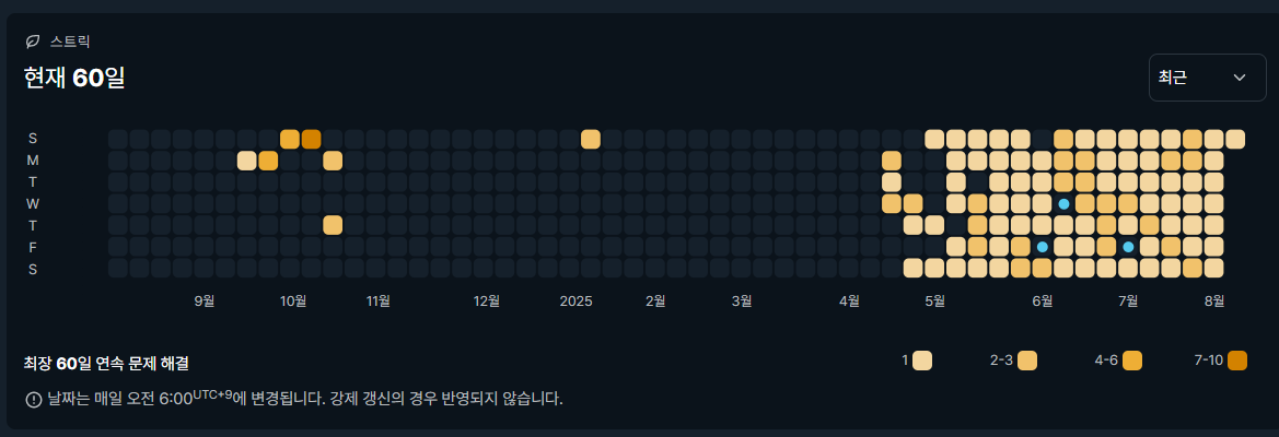 이제는 매 월말 정산마다 반복해서 적고 있는 내용입니다. 어느덧 스트릭이 60일이 되었네요! 4월부터 시작해 어느덧 8월이 되었습니다. 휴가 중에도 잊지 않고 한 문제는 꼬박꼬박 풀었는데, 스스로의 꾸준함이 자랑스럽습니다 ㅎㅎ