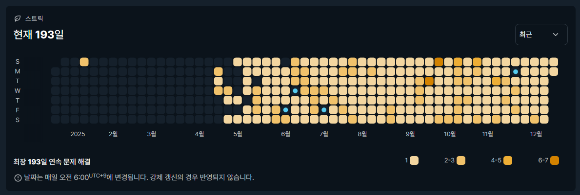 군생활 중에 이룬 성취 중 가장 자신 있게 말할 수 있는 것은 역시 매일 문제 푸는 습관입니다. 11월 30일 기준으로는 178일째 연속으로 풀고 있습니다. 항상 글을 늦게 쓰다보니 캡처한 시점에는 193일차네요 ㅎㅎ