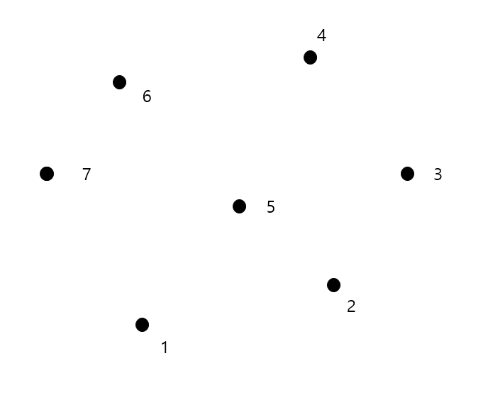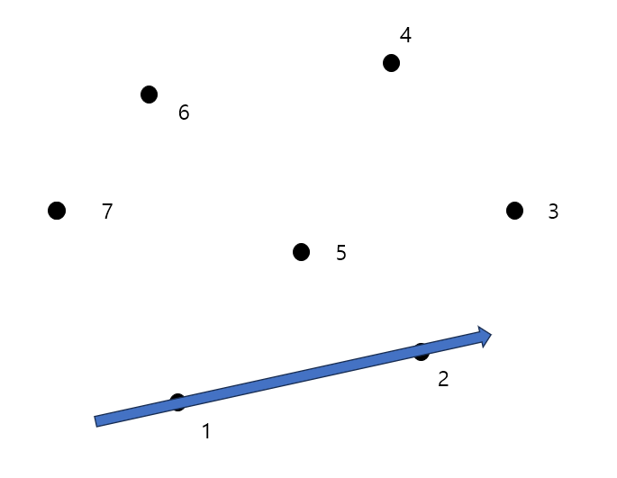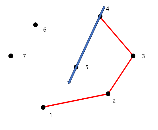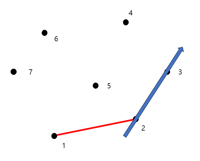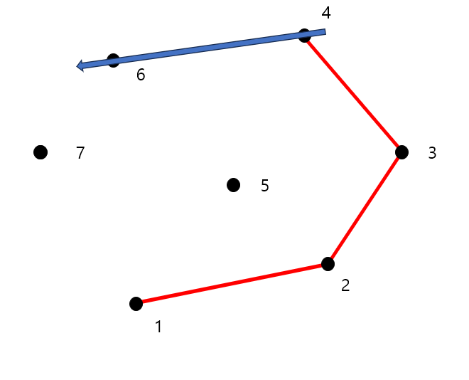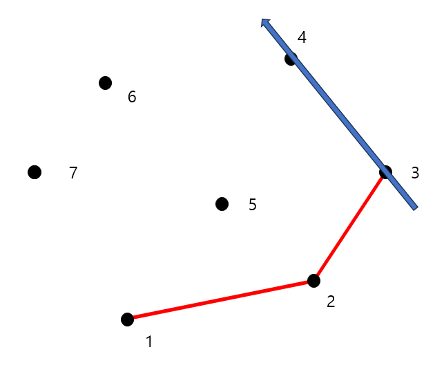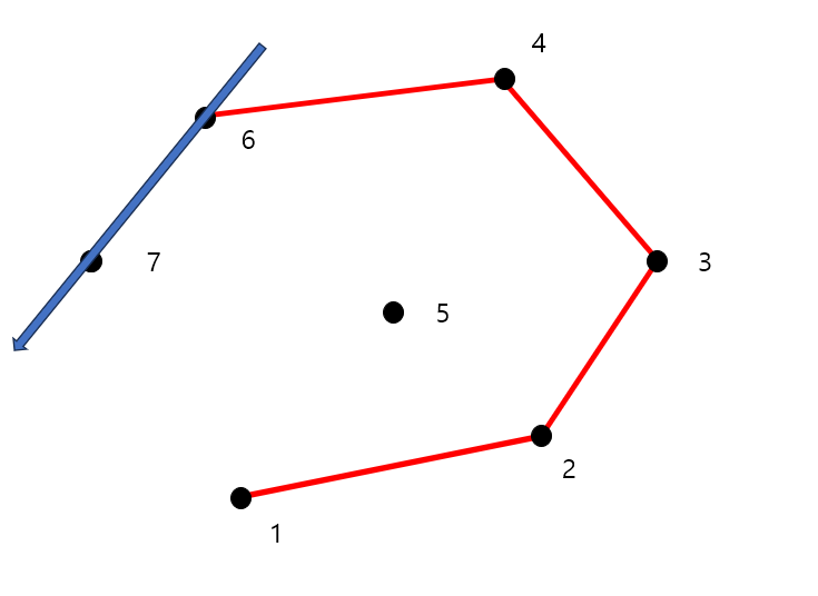 7개의 점에 대해 볼록 껍질을 구하는 과정을 그림으로 보면 다음과 같습니다.