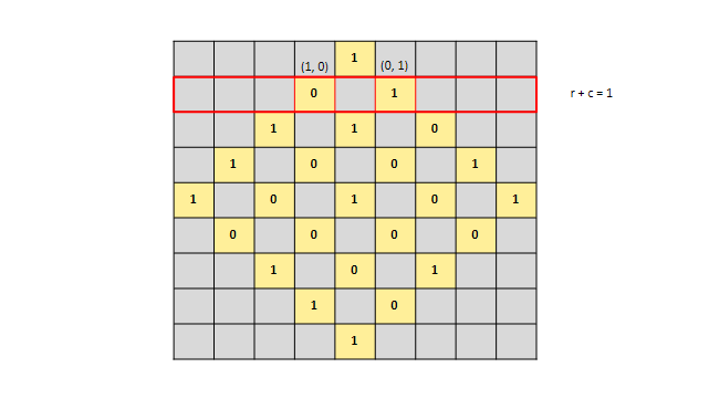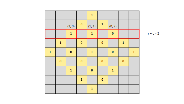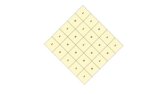 예제로 주어진 크기 5의 체스판을 시계방향으로 45도 회전시켜봅시다.