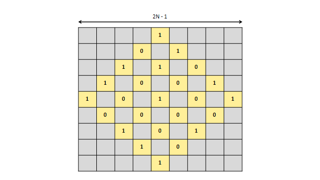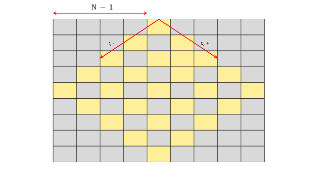 열 방향 좌표는 좀 복잡합니다. 아래 그림에서, 회전한 체스판 배열의 0번 좌표부터 중앙 좌표까지의 거리는 \(N-1\)입니다.