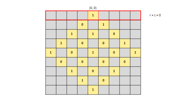 정리하면, \((r, c)\)는 회전한 체스판에서 \((r + c, N - 1 - r + c)\)로 변환됩니다.