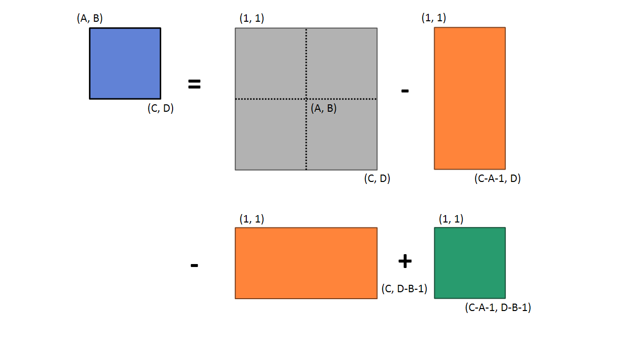 ab_cd = prefix_sum[c][d] - prefix_sum[c-a-1][d] - prefix_sum[c][d-b-1] + prefix_sum[c-a-1][d-b-1]그림으로 보면 다음과 같습니다.